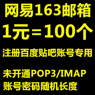 注册百度账吧专用163账号/未开通POP/账号密码随机长/1元=100个/最低购买100个