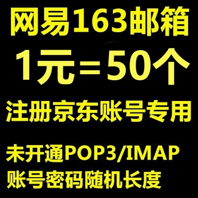 注册京东专用163账号/未开通POP/账号密码随机长/1元=50个